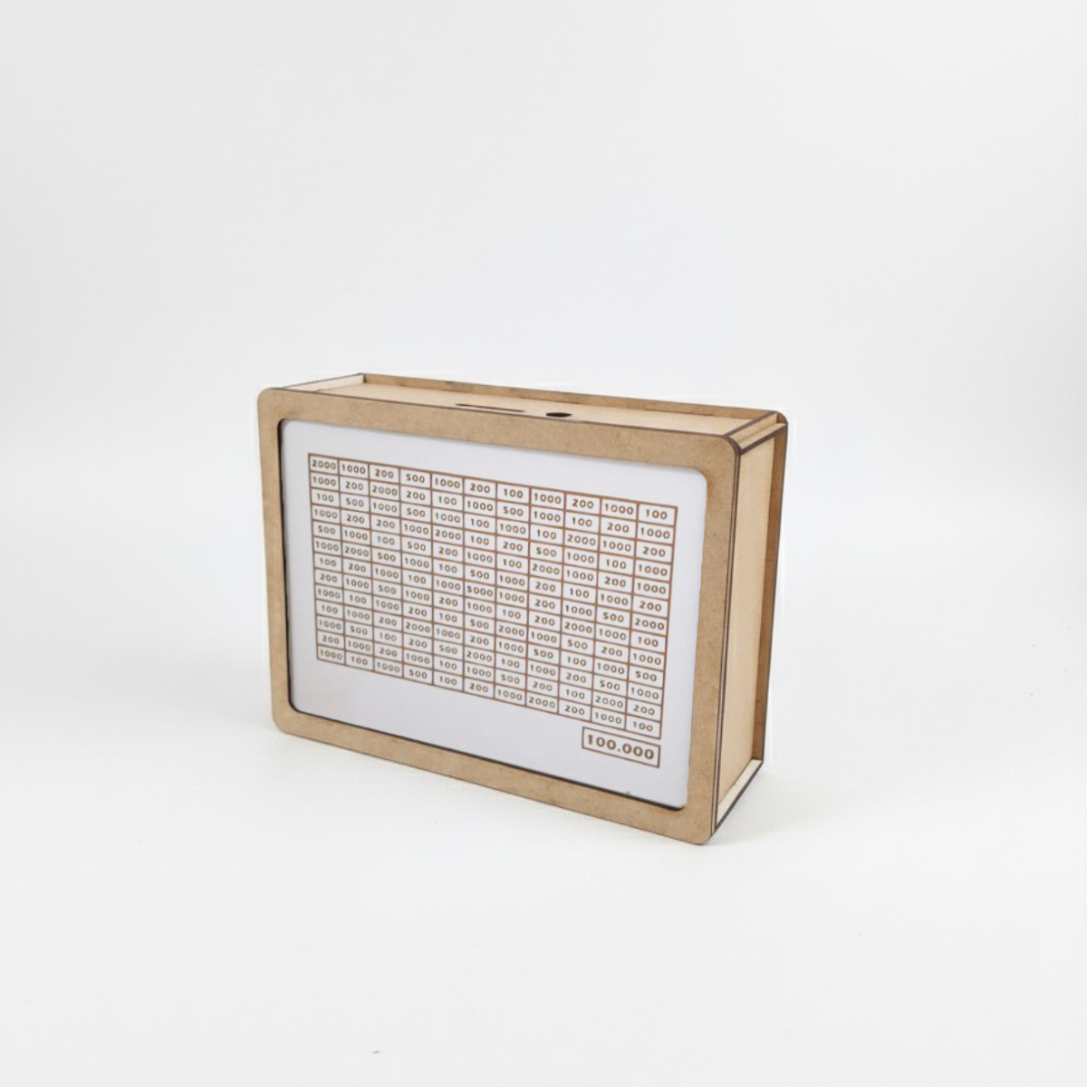 Dizajnirana je za prikupljanje ukupne sume od 100.000 dinara. Prednja strana kasice ispunjena je poljima sa različitim iznosima čija je zbirna vrednost 100.000. Svaki put kada ubacite novac u kasicu, uzmete marker (uključen u set) i označite odgovarajuće polje.