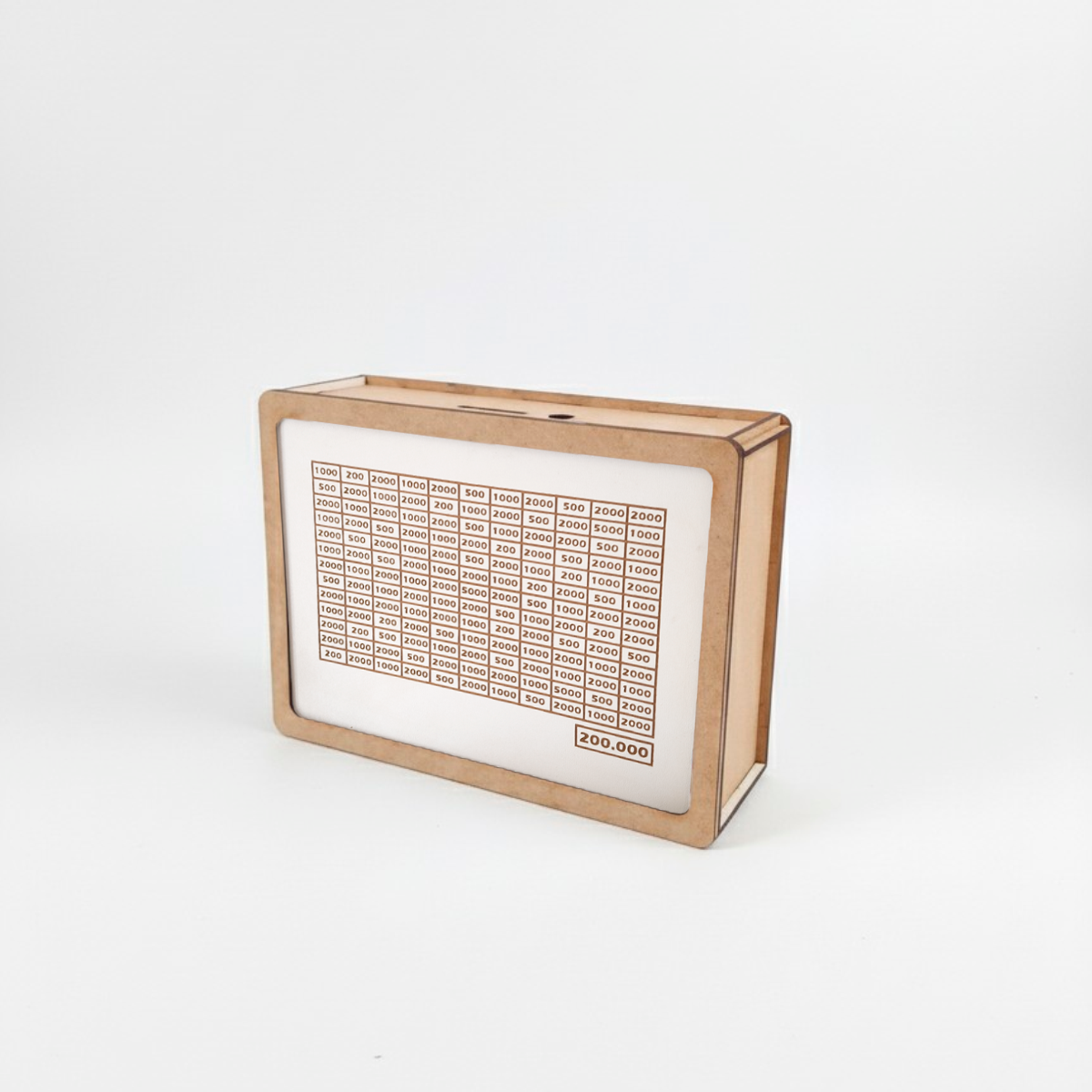 Dizajnirana je za prikupljanje ukupne sume od 200.000 dinara. Prednja strana kasice ispunjena je poljima sa različitim iznosima čija je zbirna vrednost 100.000. Svaki put kada ubacite novac u kasicu, uzmete marker (uključen u set) i označite odgovarajuće polje.